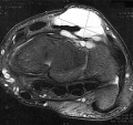 Les progrès techniques de la chirurgie mini-invasive du poignet ont permis de réaliser l'ablation de ces kystes sous arthroscopie, c'est-à-dire au moyen de deux mini incisions permettant, l'une d'introduire une caméra de 1,9 à 2,7 mm de diamètre et l'autre des instruments mécaniques et de radiofréquence de 2-3 mm de diamètre (figure 2). La base d'implantation du kyste est repérée (une IRM ou une échographie préalable ont guidé le choix des petits incisions-figure 3) et retirée. Le liquide mucoïde s'écoule alors dans l'articulation et est aspiré alors que la paroi du kyste est excisée par la profondeur sans nécessité d'incision supplémentaire (figure 4). On visualise ainsi les tendons extenseurs des doigts et du poignet qui doivent être contrôlés et protégés durant toute l'intervention (figure 5), constituant le seul risque spécifique de cette arthroscopie. l'intérêt de cette technique n'est pas qu'esthétique, bien que l'indication du geste opératoire soit essentiellement cosmétique (figure 6) mais surtout plus logique et efficace que la chirurgie dite classique, car il permet le repérage et l'excision du point de départ de cette "tumeur" bénigne, diminuant ainsi le risque théorique de récidive. On peut ainsi diagnostiquer et retirer des petits kystes du ligament scapho-lunaire (figure 7), il y a encore peu surnommés "occult ganglions" car peu accessibles aux autres procédés d'exploration du poignet, ils peuvent être douloureux notamment lors des appuis en flexion dorsale.