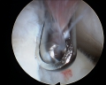 Les progrès techniques de la chirurgie mini-invasive du poignet ont permis de réaliser l'ablation de ces kystes sous arthroscopie, c'est-à-dire au moyen de deux mini incisions permettant, l'une d'introduire une caméra de 1,9 à 2,7 mm de diamètre et l'autre des instruments mécaniques et de radiofréquence de 2-3 mm de diamètre (figure 2). La base d'implantation du kyste est repérée (une IRM ou une échographie préalable ont guidé le choix des petits incisions-figure 3) et retirée. Le liquide mucoïde s'écoule alors dans l'articulation et est aspiré alors que la paroi du kyste est excisée par la profondeur sans nécessité d'incision supplémentaire (figure 4). On visualise ainsi les tendons extenseurs des doigts et du poignet qui doivent être contrôlés et protégés durant toute l'intervention (figure 5), constituant le seul risque spécifique de cette arthroscopie. l'intérêt de cette technique n'est pas qu'esthétique, bien que l'indication du geste opératoire soit essentiellement cosmétique (figure 6) mais surtout plus logique et efficace que la chirurgie dite classique, car il permet le repérage et l'excision du point de départ de cette "tumeur" bénigne, diminuant ainsi le risque théorique de récidive. On peut ainsi diagnostiquer et retirer des petits kystes du ligament scapho-lunaire (figure 7), il y a encore peu surnommés "occult ganglions" car peu accessibles aux autres procédés d'exploration du poignet, ils peuvent être douloureux notamment lors des appuis en flexion dorsale.